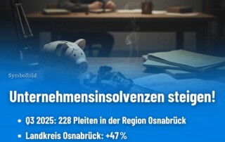Marcel Queckemeyer (Kreisvorsitzender der AfD Osnabrück-Land) nimmt die aktuellen Zahlen der IHK Osnabrück – Emsland – Grafschaft Bentheim mit Besorgnis zur Kenntnis: Insgesamt 228 Unternehmensinsolvenzen im dritten Quartal 2025 – ein leichter Anstieg gegenüber 226 Fällen im Vorjahr. Besonders betroffen sind das Verarbeitende Gewerbe (+15 %), das Gastgewerbe (+5,9 %) und das Baugewerbe (+4,4 %). Regional sticht der [...]